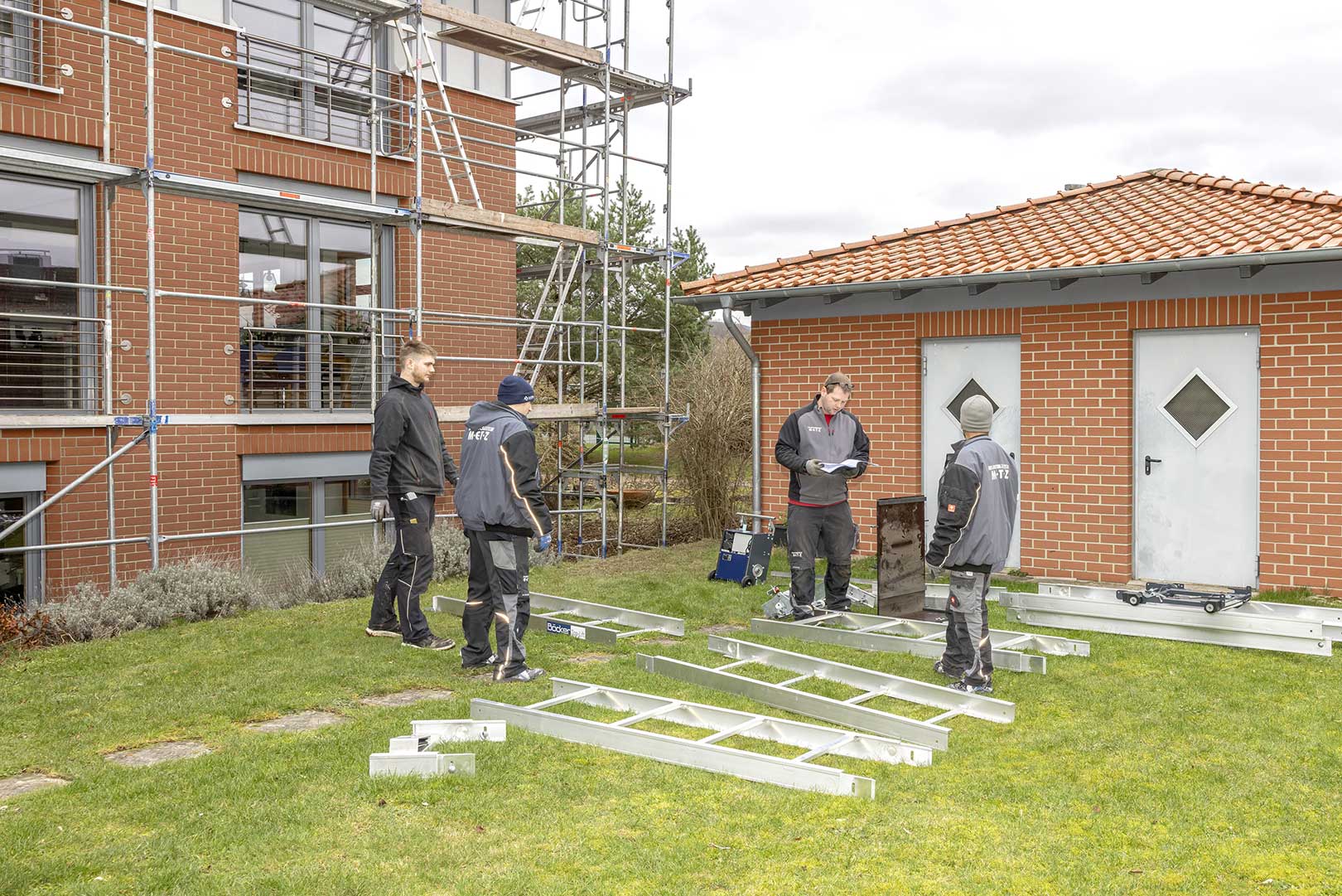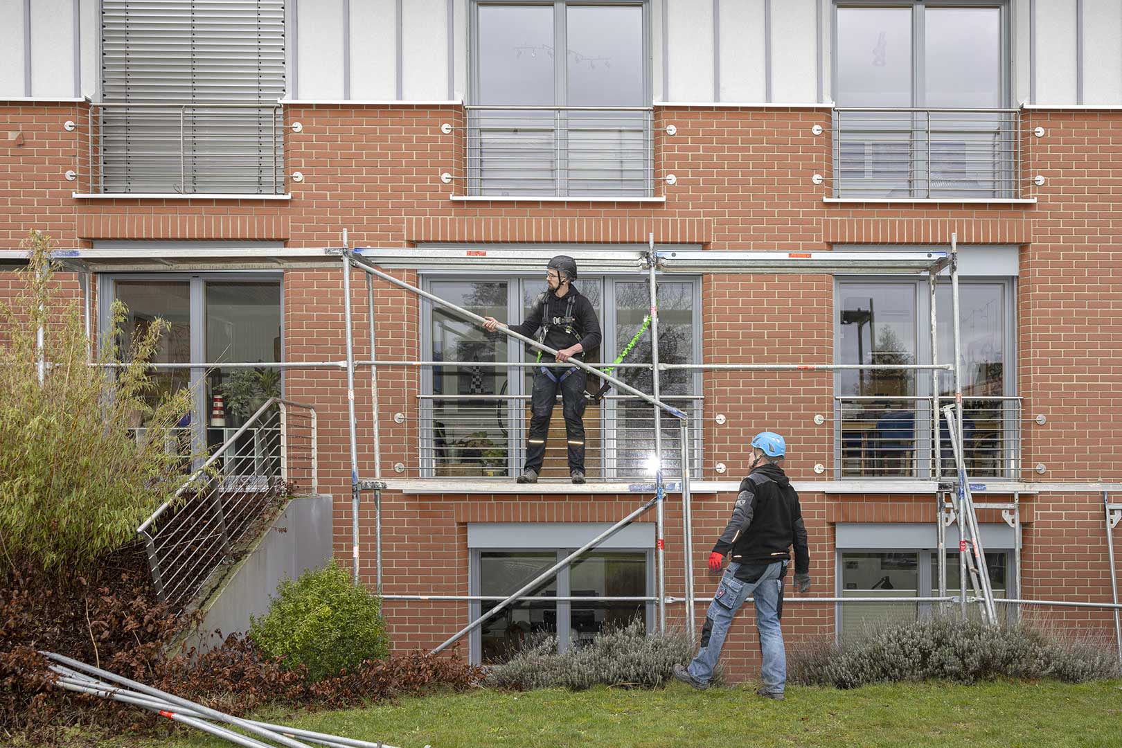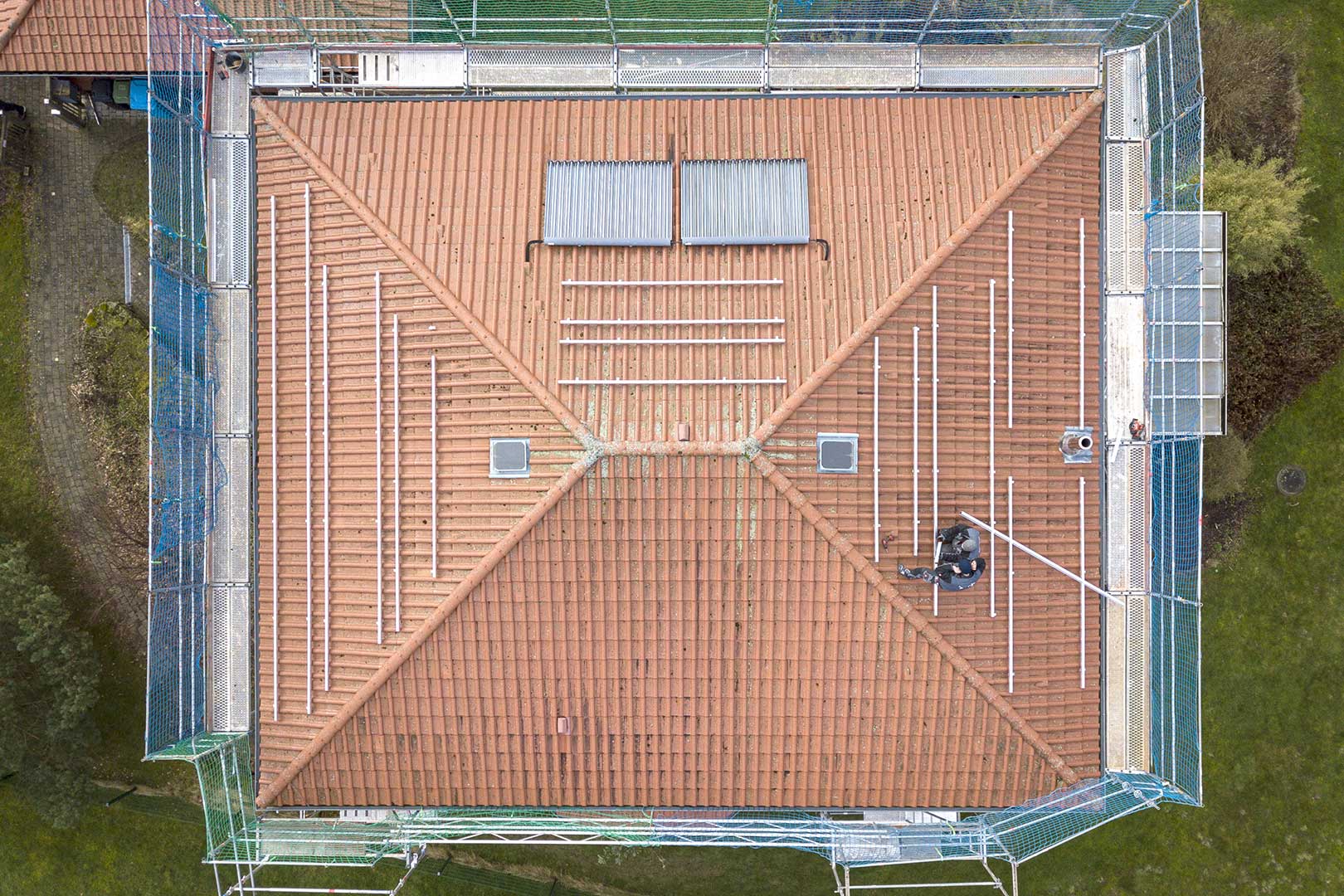 - Zur Absicherung der anstehenden Dacharbeiten wird ein Gerüst aufgebaut. Hier arbeiten wir mit professionellen Spezialunternehmen zusammen.