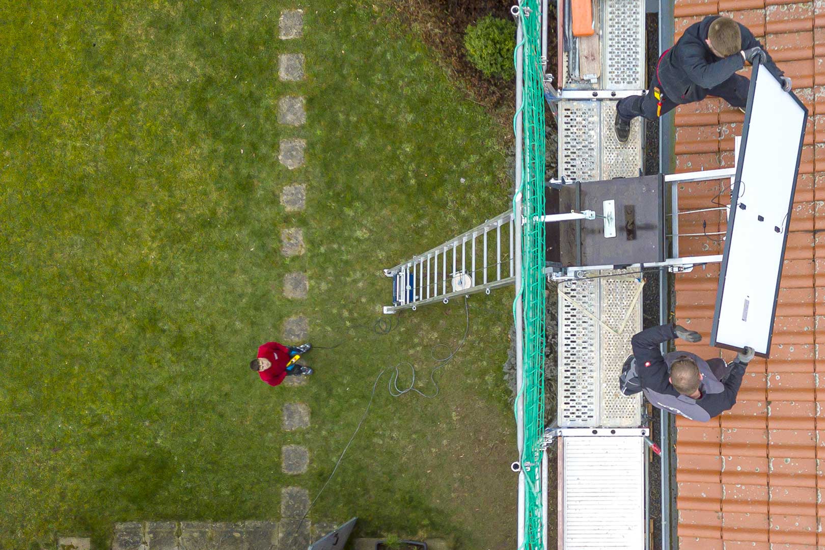- Die Verkabelung der gewählten Dachbereiche zum Technik- oder Heizungsraum im Gebäudeinneren wird gelegt. Eventuell erforderliche kleine Erdarbeiten zur Kabelverlegung nehmen unsere Mitarbeiter selbst vor.